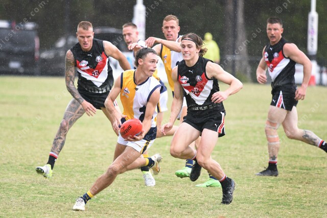 Marley Appleyard (10 Beac) with the ball, chased by Jack Meyers (28 South Belgrave, right). 473715_06