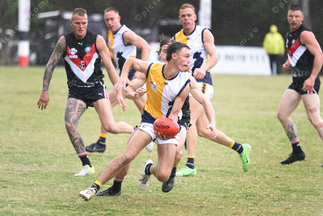 Marley Appleyard (10 Beac) with the ball, chased by Jack Meyers (28 South Belgrave, behind). 473715_07