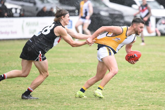 Ali Zijai (17 Beac) with the ball, grabbed by Jack Meyers (28 South Belgrave). 473715_18