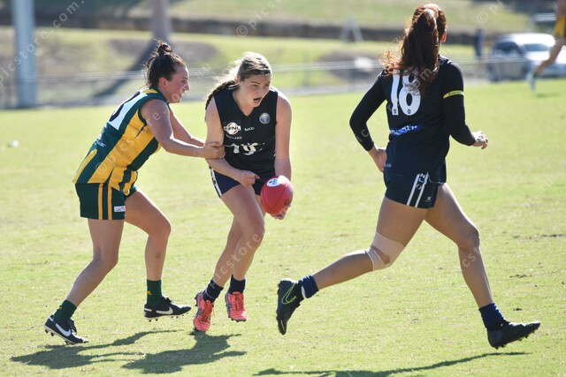 Brooke Ellis (17 Berwick) with the ball. Passing to teammate Elisha Lane (18). Chases by Danielle Carrucan (13 Mooroolbark). 475441_14