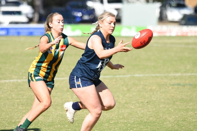 Kiera Beddows (23 Berwick) with the ball. Chased by Alice Reynolds (29 Mooroolbark). 475441_32
