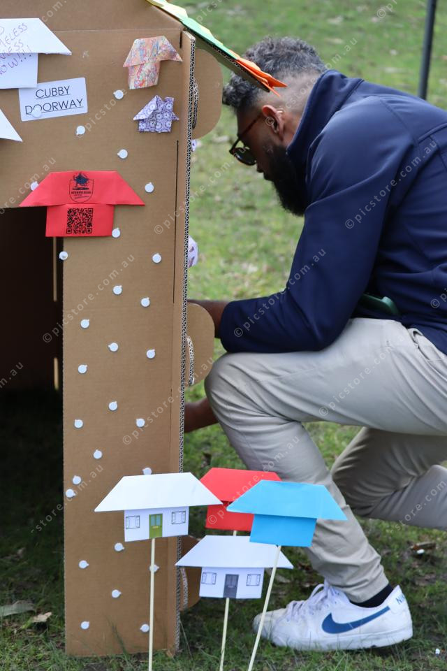 Homeward Bound Walk participants placing their origami house on the display to represent the need for 60,000 social and community homes. (494773)