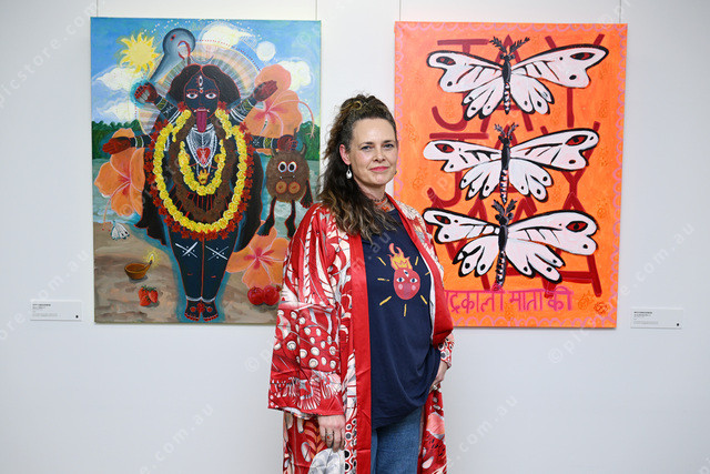 Pic of Melton artist Mata Kamaleshwari with her exhibition ‘Shakti Rising’ at the Melton Library. (Damjan Janevski). 505295_05