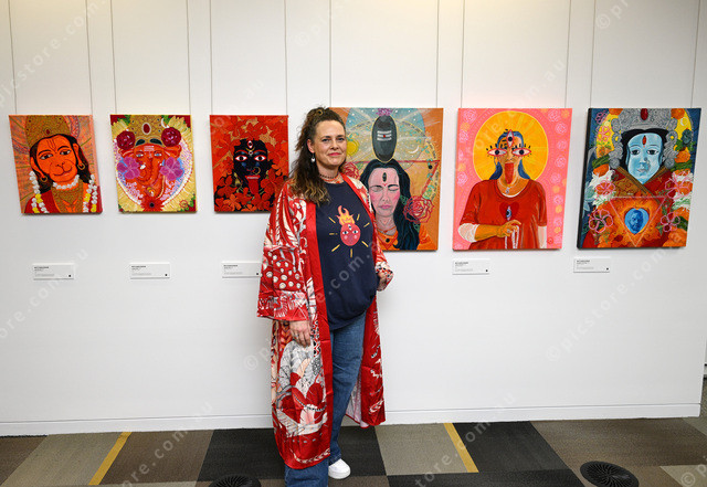 Pic of Melton artist Mata Kamaleshwari with her exhibition ‘Shakti Rising’ at the Melton Library. (Damjan Janevski). 505295_07