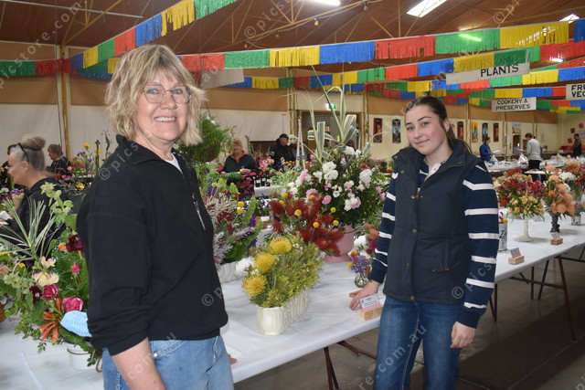Julie Schulz and Hollie Pearson with some of the floral arrangements in the show pavilion. (516122)