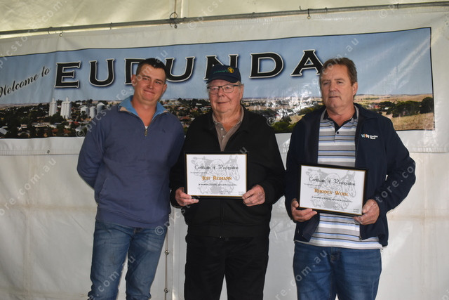 Show president Garry Schutz presented Certificates of Recognition to Jeff Reimann and Michael Sugars of Rhodes Wool for their ongoing support for the Eudunda Show. (516122)