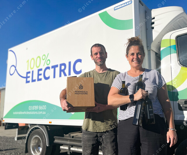 Dan Fehrenbach of Cool Road Collective and Mel Hollick of Peninsula Providore, out front of South Australia’s first Electric (EV) refrigerated truck. (Emma Heidenreich) 463701_01