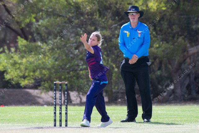 Skye Warburton sends a bowl down the pitch against Reynella. (Chloe Hull: 466209_05)