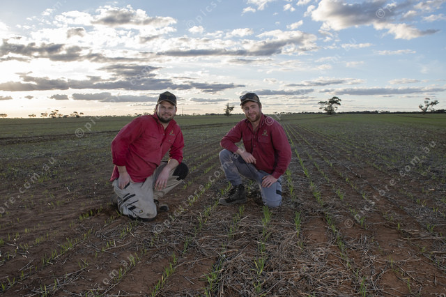 Dylan Fabry and Ben Michael check an emerging wheat crop on Kelvin Tiller’s Pinery property. (Lisa Schulz: 484507)