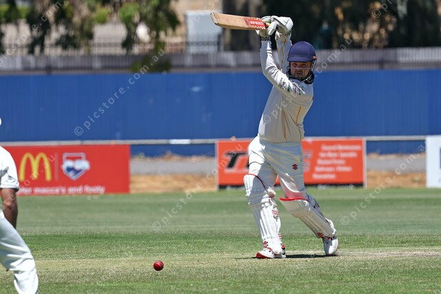 Jack Mercer gets inside the line of the delivery and pushes it to the off-side. (534840_09)
