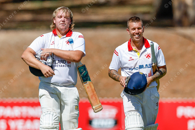Greenock’s Thomas Burton and Tanunda’s Player of the Tournament Trent Goers walk off victorious after the SACA Senior Country Cup grand final. (Mark Willoughby: 534855_06)