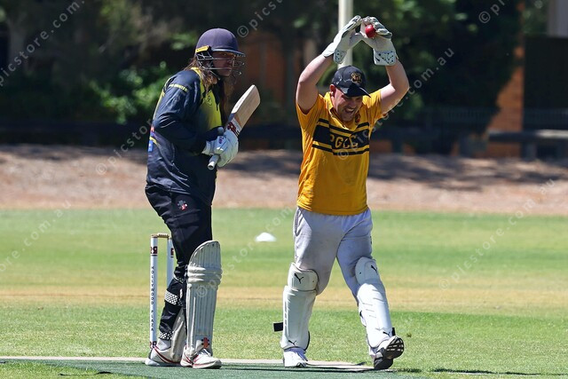 Parafield Gardens wicketkeeper Billy Dowling celebrates a faint edge from Cooper McInnes. (534878_05)