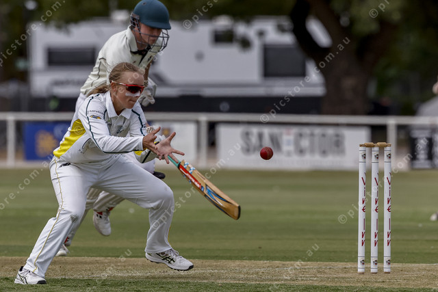 South Australian state representative Chloe Rosenzweig waits for the incoming throw as Jehi Fuller hustles out a quick single. (Mark Willoughby: 459793_04)
