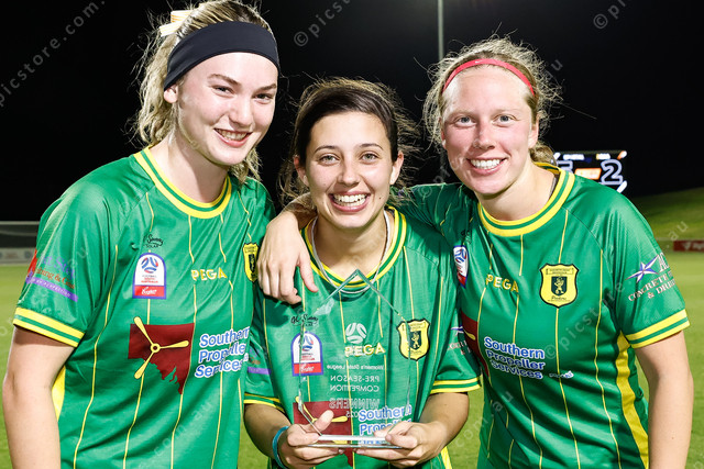 Elizabeth Grove’s star attacking trio Aliyah Stentiford, Monica Brown and Milano Venter celebrate with the preseason cup trophy. (461577_09)