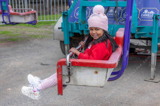 4yo Parina from Clyde on one of the rides at Frost Bites Food Festival at The Old Cheese Factory Berwick.
