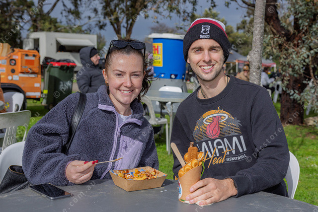 L-R Cass and Josh from Officer enjoying some of the fine fare at Frost Bites Food Festival at The Old Cheese Factory Berwick.