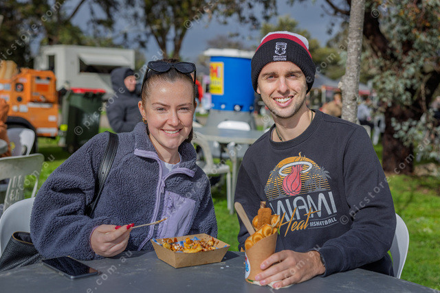 L-R Cass and Josh from Officer enjoying some of the fine fare at Frost Bites Food Festival at The Old Cheese Factory Berwick.
