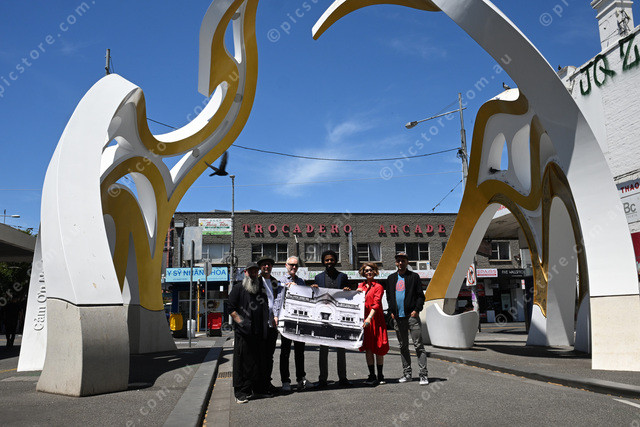 Maribyrnong council festival grant recipients. Pic of Sean Hogan, Aaron Martin, Marc Eiden, mayor Cr, Misuzu Ueda and Ivano Abram. (Damjan Janevski). 522746_02