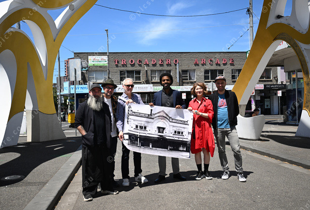 Maribyrnong council festival grant recipients. Pic of Sean Hogan, Aaron Martin, Marc Eiden, mayor Cr, Misuzu Ueda and Ivano Abram. (Damjan Janevski). 522746_04