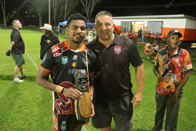 George Fisher received a hand-carved statue for being the Frank Fisher side’s best player. He is pictured with Steve Price. 470875_04