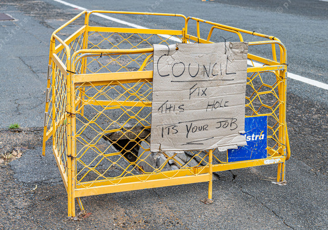 Frustrated Harrisville resident leave sign for the local Council beside a hole in Queen street.