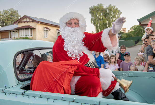 Santa goes down Edward st, Kalbar in the back of an Aussie Ute.