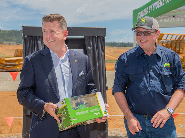 The current Deputy Premier of Queensland Jarrod Bleijie gets a toy tractor as a momento.