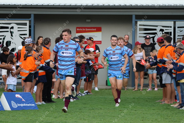 New captains Tyler Szepanowski and Blake Moore lead Central Queensland out through the tunnel.
