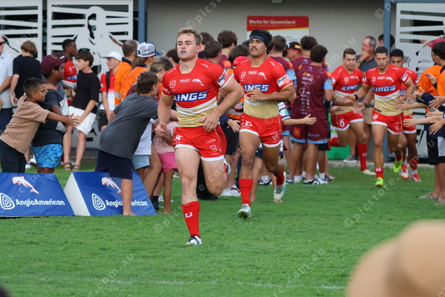 Harrison Graham leads out the Dolphins onto Marley Brown Oval.