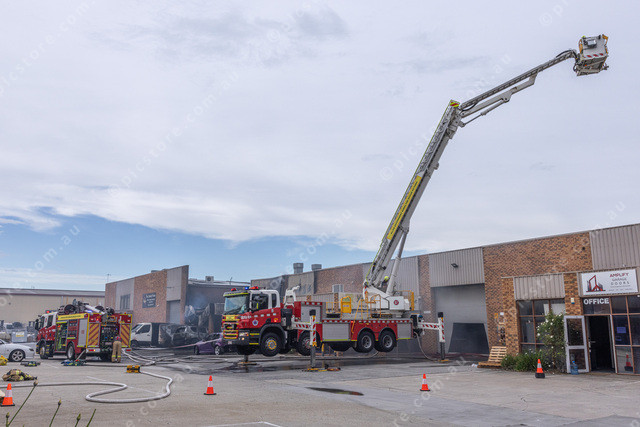 A platform appliance still putting water on the fire while others left this scene and are at Lanyon St for another building fire.