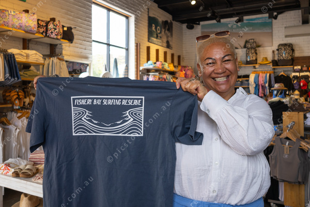 Fishery Bay Surf Reserve (FBSR) chairperson Ngahuia Trewartha holds one of the FBSR t-shirts which are stocked at Lincoln Surf. (529632_01)