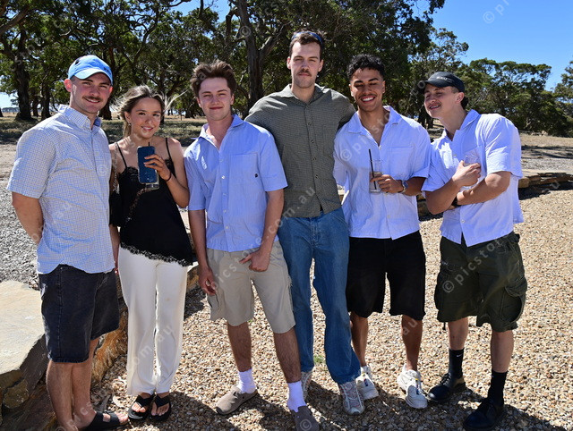 Alex Bayly, Ava Lambert, Cameron Kirkland, Jam Zweck, kane Kennedy and Dan Mann visiting Fleurieu Gin while Holidaying at Carrickalinga. (Mark Liebich 526762_01)