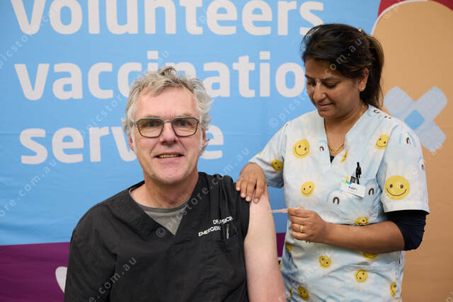Hans Hollerer (emergency physician) getting vaccine from Kabita Dhamala (Nurse – Immuniser Coordinator)_Ljubica Vrankovic_477500_04