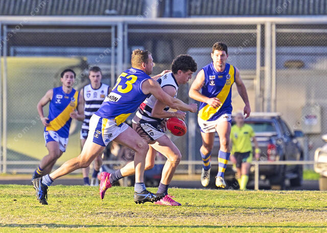 Scott Brackley lays a strong tackle on Declan Goodwin (Ivan Kemp) 485240_22