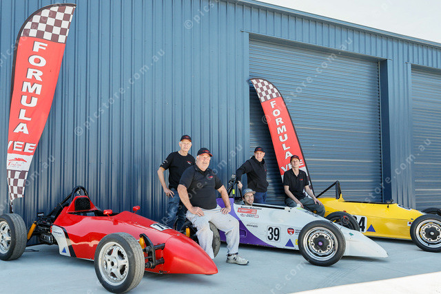 Peter Clayton, Julian Midwinter, Baxter Midwinter, Frank Chessell and Matthew Bialek with their Formula Vee cars. (Mark Willoughby: 508764_03)