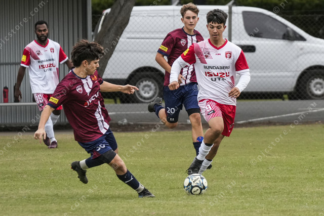 Fraser Flames’ Andre Leiva looks to steal the ball from Bargara. (Solana Photography: 476808)