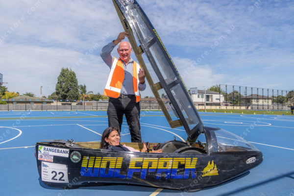 The Principal Andrew Bergmeier holds the door of a Human Powered Vehicle (HPV) while Annette Samuel gets ready to try it out.