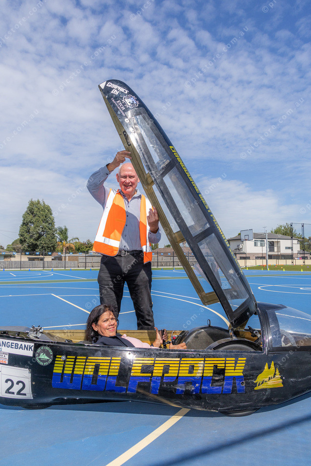 The Principal Andrew Bergmeier holds the door of a Human Powered Vehicle (HPV) while Annette Samuel gets ready to try it out.