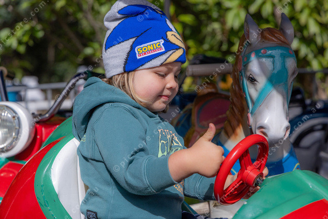 3yo Jon from Emerald in his F1 car, enjoying the ride and giving the thumbs up.