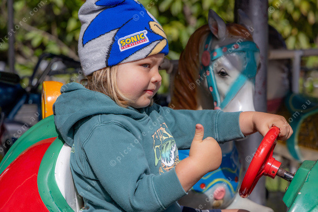 3yo Jon from Emerald in his F1 car, enjoying the ride and giving the thumbs up.