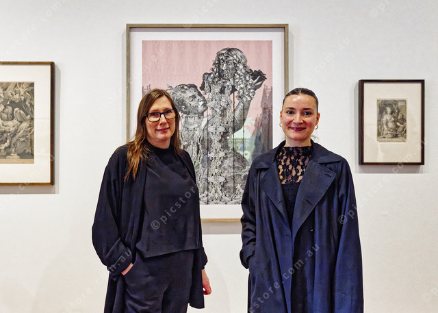 Lisa Sullivan (Assistant Director – Curatorial) and Lana De Lorenzi (Assistant Curator) with Christopher Orr’s digital print Served Bold 2023 (Ivan Kemp) 499027_02
