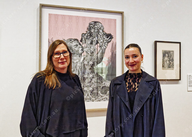 Lisa Sullivan (Assistant Director – Curatorial) and Lana De Lorenzi (Assistant Curator) with Christopher Orr’s digital print Served Bold 2023 (Ivan Kemp) 499027_05