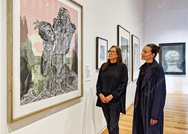 Lisa Sullivan (Assistant Director – Curatorial) and Lana De Lorenzi (Assistant Curator) with Christopher Orr’s digital print Served Bold 2023 (Ivan Kemp) 499027_08