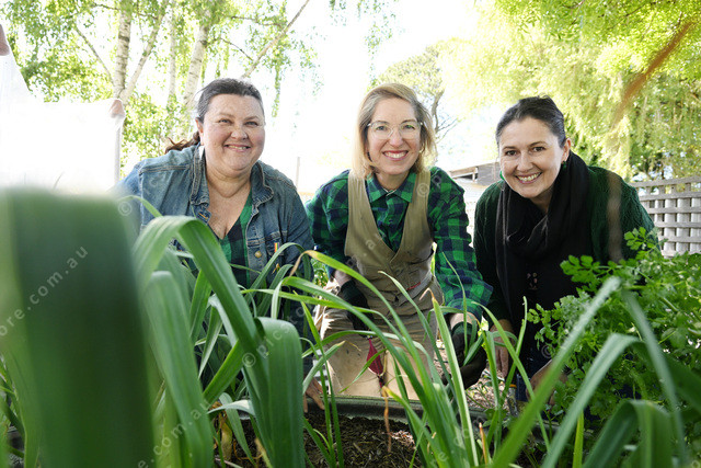 Kyneton Community House community garden. Pic of CEO Claire Rawlinson, Jo McErvale garden coordinator and Casey Grana admin coordinator. (Damjan Janevski). 513015_01