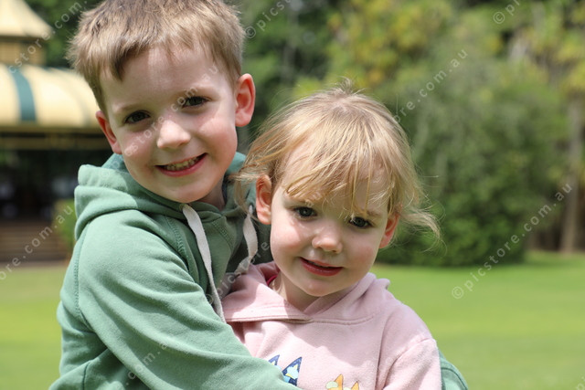 Siblings Max, 4 and little sister, Pippa, McRae 3 having fun dancing in the gardens