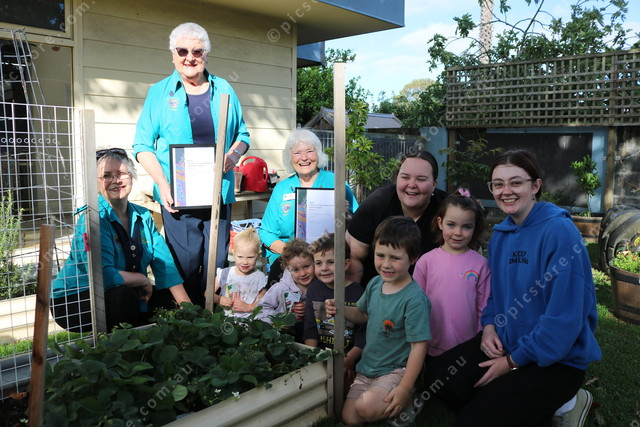 Garden Grannies Gayle Green, Janet Bellinger and Wil Cousins, children Harper, Tilly, Albert, Jordan and Nova and educators Cheyanne Holloway and Jess Becker. (Elisabeth Champion)