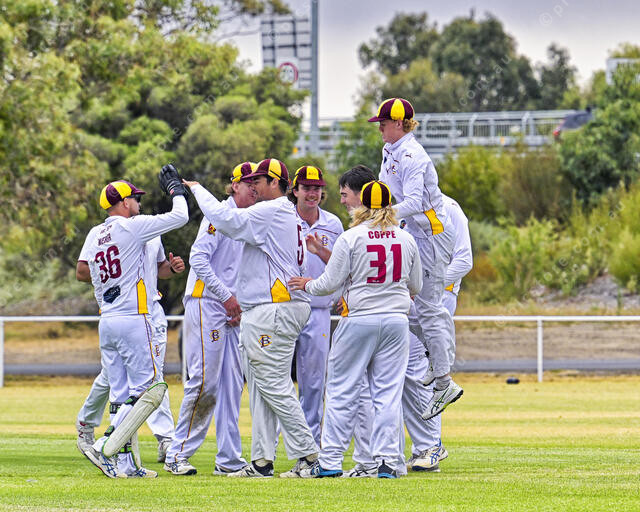Bannockburn players congratulate Tanner Hay on dismissing Lachie Cameron (Ivan Kemp) 521174_20