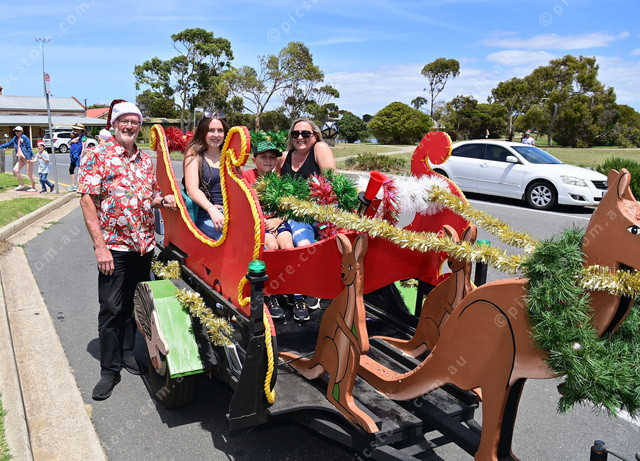 Bill Coomans (Santa’s Driver), Natalie Cram, Taylor Cram Walsh, and Emerseon Niemann on Santa’s Sleigh. (Mark Liebich 523374_02)