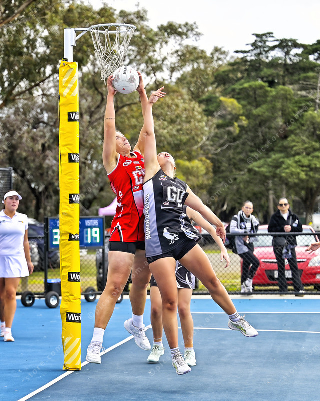 Jacinta Dimasi outreaches Jorja Pendlebury under the basket (Ivan Kemp) 493582_14