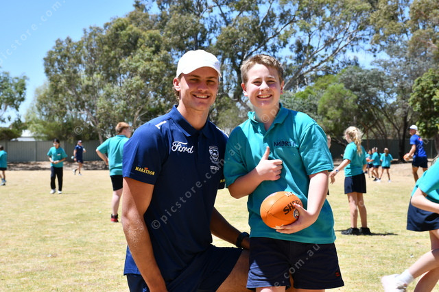 Geelong footballer Jacob Mollier with stoked Hamilton North Primary School student Angus Jones.
